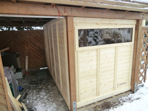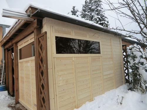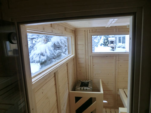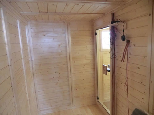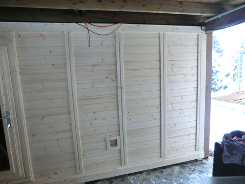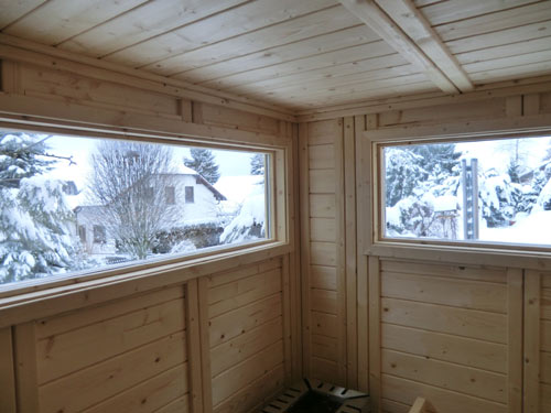 Besonderheiten dieser Gartensauna: Korkdämmung auf Dach zum Schutz, eigentliches Dach ist Carport, daher eine Massiva-58-Outdoor ohne Dach – Inneneinrichtung aus Abachi-Holz – Saunaofen Lang Typ 33 – isolierter Fußboden mit Domoteck-Fußbodenheizung – 2 Seiten außen grundiert – Dach am Ende des Carports verlängert und mit Schindeln verkleidet – 2 Fenster mit innenliegender ESG-Verglasung – MP3-Saunaradio