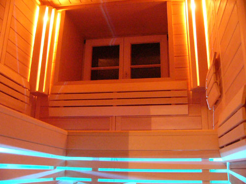 Besonderheiten dieser Heimsauna: vorhandenes Fenster eingebunden – Revisionsklappe – Inneneinrichtung Premium – 4-er Set Farblichttherapie „Lightline“ als indirekte Saunabeleuchtung – MP3 Saunaradio mit Festkörperlautsprecher