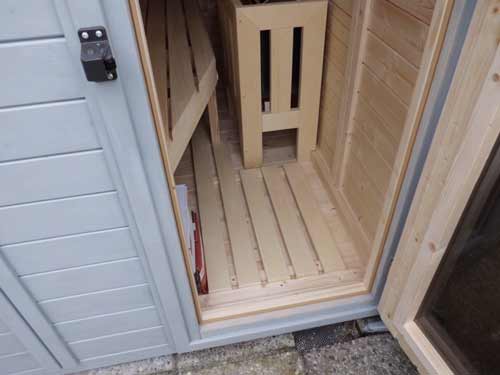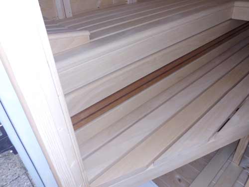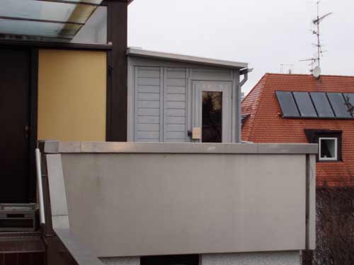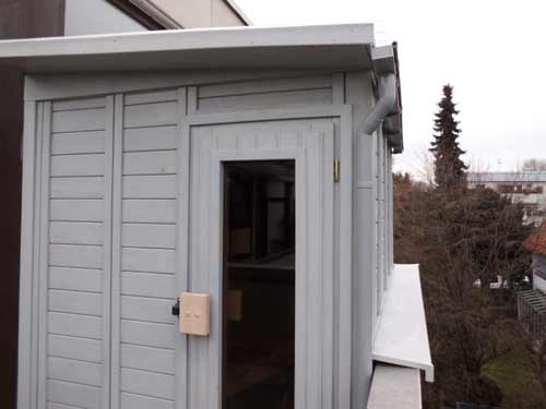 Besonderheiten dieser Sauna: Balkonsauna – isolierter Fußboden – Grundierung und Lasierung mit Thüringer Waid – Plexiglasdach