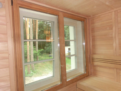 Besonderheiten dieser Sauna: Inneneinrichtung Premium – vorgezogene Tür ohne Schwelle – Fenster zum Öffnen vor vorhandenes Fenster setzen – Virta-Saunaofen von Harvia – Steuerung Xenio CX170 von Harvia