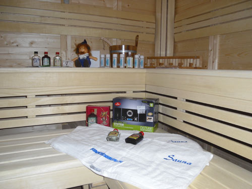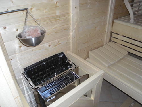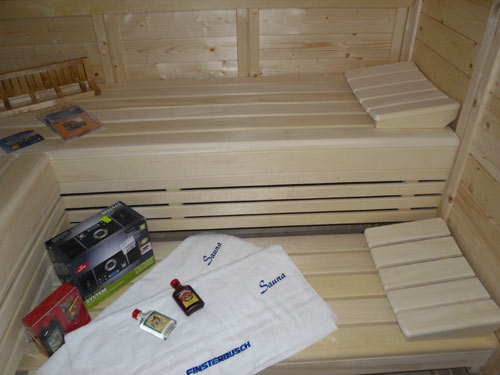 Besonderheiten dieser Sauna: Inneneinrichtung Premium – 9 kW Kubic-Softklimaofen für 4 verschiedene Badeformen – Lautsprecher – Farblichttherapie „ChromoLED“ – Finsterbusch-Wohlfühlpaket – Multicup-Salzverdampfer