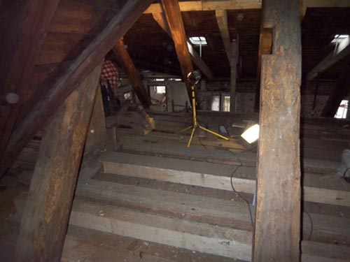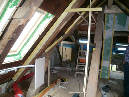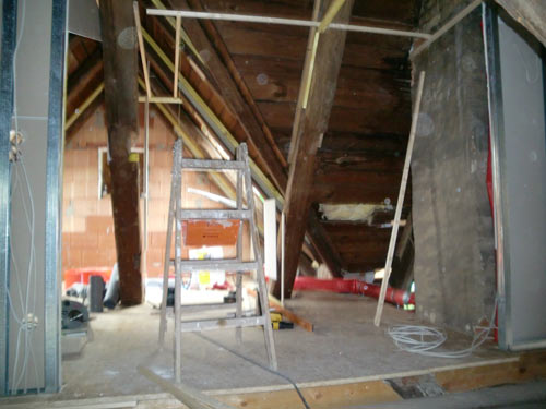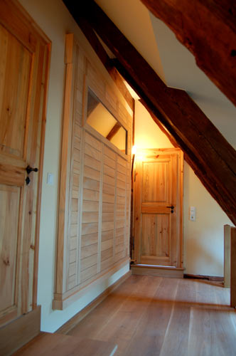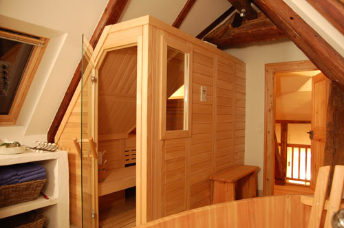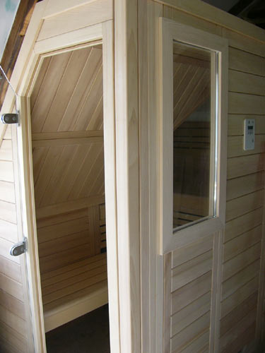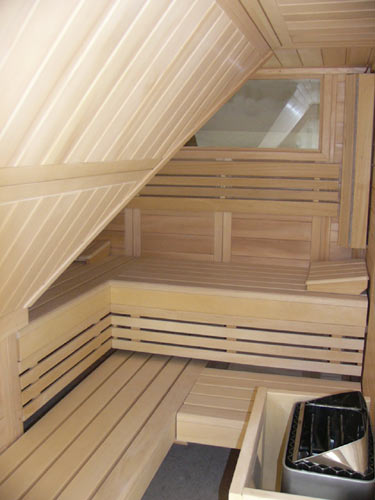 Besonderheiten dieser Sauna: komplizierte Integration in den Raum mit 2 Grundrahmenaussparungen und 2 Dachschrägen – 2 verschiedene Glaselemente. – Um das Platzangebot in der Sauna zu vergrößern, wurde die Sauna als dekoratives Element der Wandgestaltung genutzt und sie durch die Wand nach außer hin positioniert.