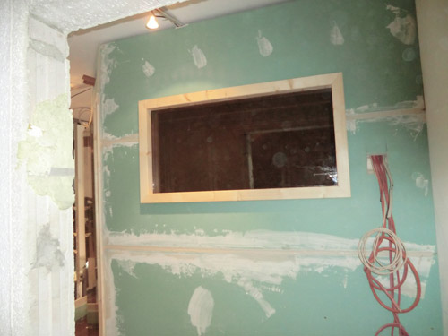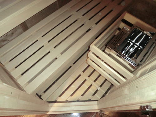Besonderheiten dieser Sauna: Eckeinstieg – 8 kW Bio-Saunaofen Kubic für vier verschiedene Badeformen – doppelt beplankt mit Feuchtraumplatten zur späteren Anbringung von Fliesen – Revisionsklappe mit Lüfter – Fenster, fest