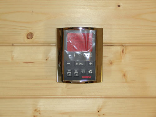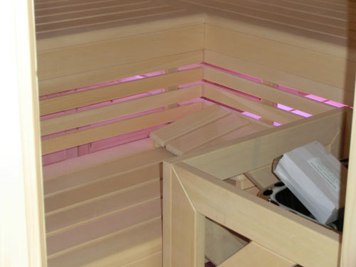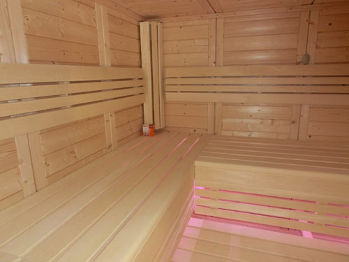 Besonderheiten dieser Sauna: 11 kW Club-Kombi Softklimaofen für 4 verschiedene Badeformen – Saunasteuerung Griffin CG170C – Inneneinrichtung Premium – LED-LightLine-Farblichttherapie