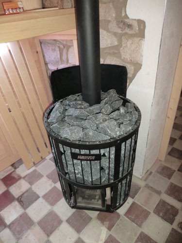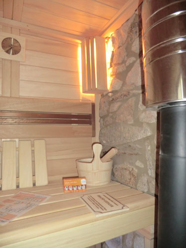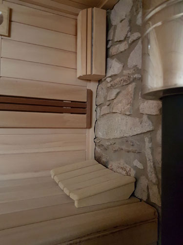 Inneneinrichtung Premium – Unterbank-Saunaofen – Holzbeheizter Saunaofen- Schiebe-Glaselement vorm Fenster – Farblichttherapie LED-Light-Line – Sauna-Anbindung an Steinmauer – Wasserhahn in Sauna